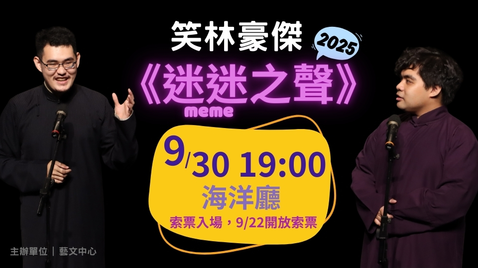 網路迷因🌐與相聲會激盪出怎樣的火花呢?9月30日來海洋廳與笑林豪傑一起創造新經典。